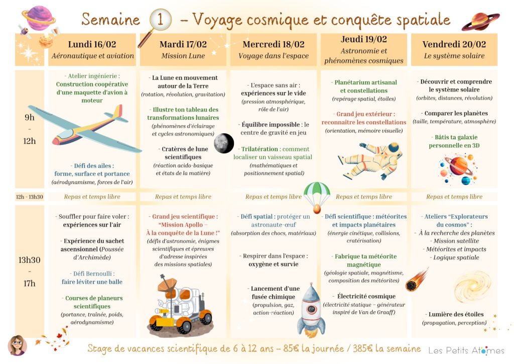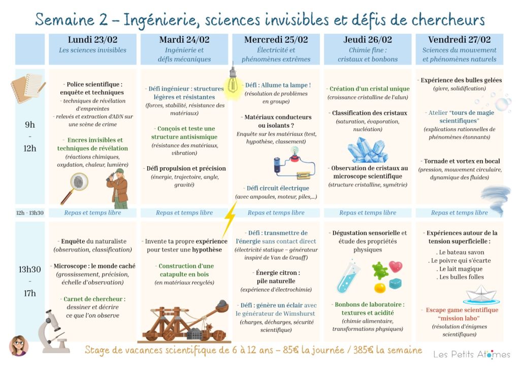 Ce stage, conçu sur 5 journées, de 9h à 17h, est réservable également à la journée ; il propose aux enfants de réaliser individuellement leurs propres expériences scientifiques avec du matériel dédié.